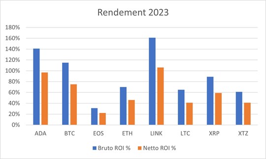 Net ROI is the net profit (after transaction costs Exchange and commission BitBrokerTrade). If you had started a BTC trader with €1,000 capital on January 1, 2023, you would have had €1,750 capital on December 31, 2023.